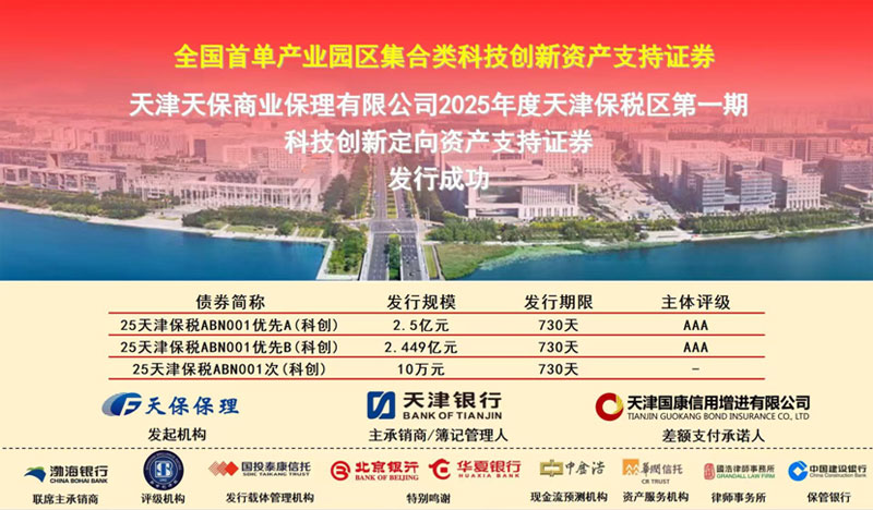 11月26日,天津天保控股有限公司(以下简称“天保控股”)所属天津天保商业保理有限公司(以下简称“天保保理”)作为发起机构,成功发行全国首单产业园区集合类科技创新定向资产支持证券。这是继2024年成功发行全国首单知识产权ABCP项目后,天保保理公司又一次成功的融资模式创新,填补了产业园区集合类科技创新资产证券化产品的市场空白。